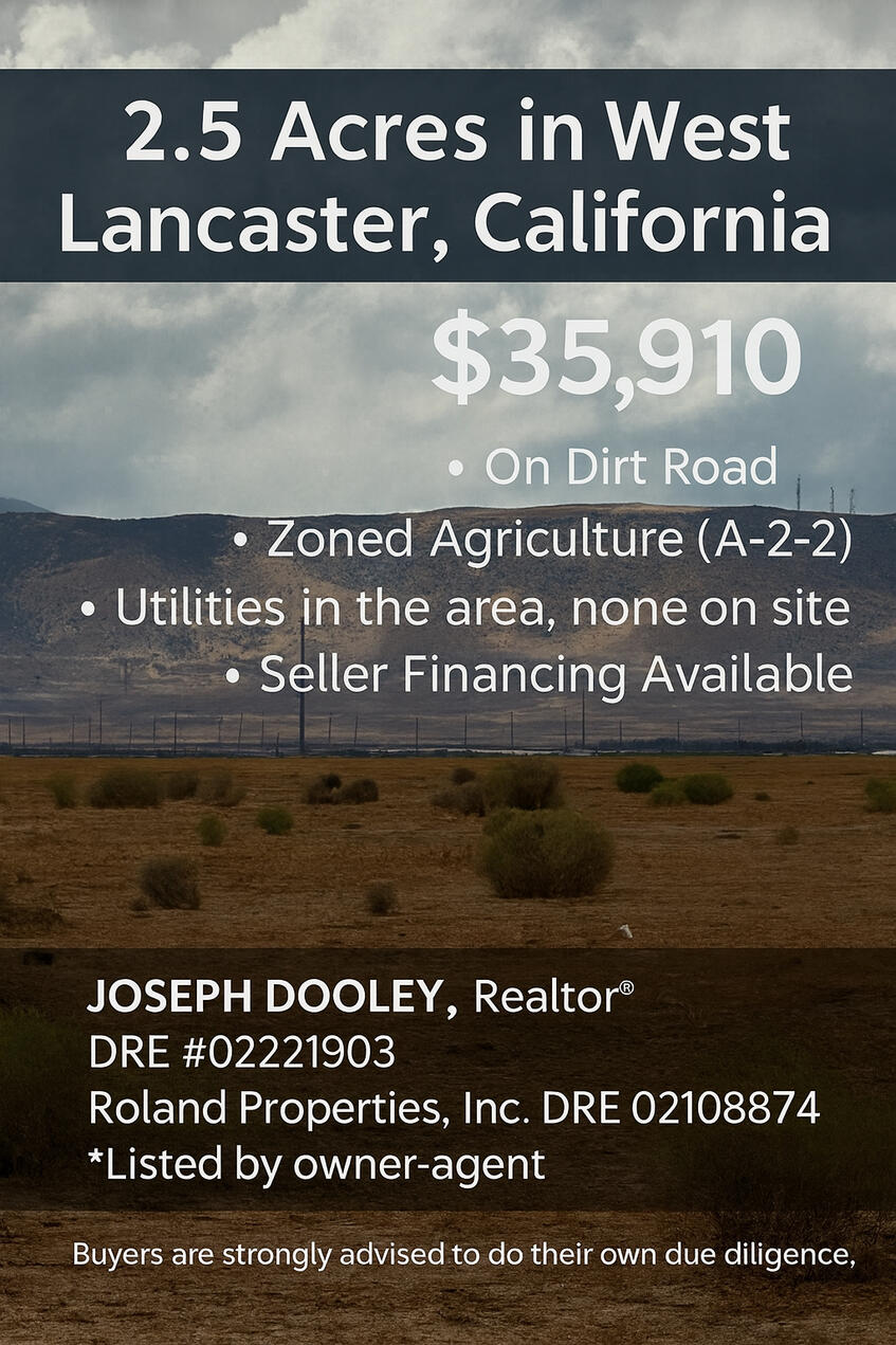 2.5 acres at 100th St W & Ave E-8 in Antelope Acres — flat terrain with wide-open desert views and beautiful sunsets. Surrounded by rural ranch properties and solar developments, with convenient access to Hwy 138. Zoned LCA11*, offering flexible uses for agriculture, custom build, or long-term hold in a growing area.